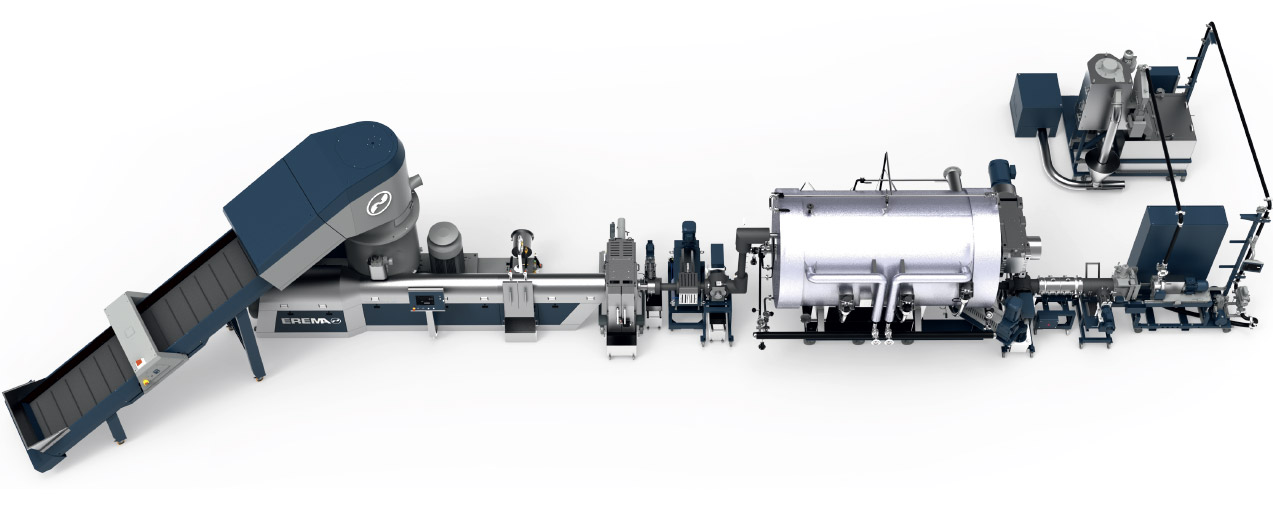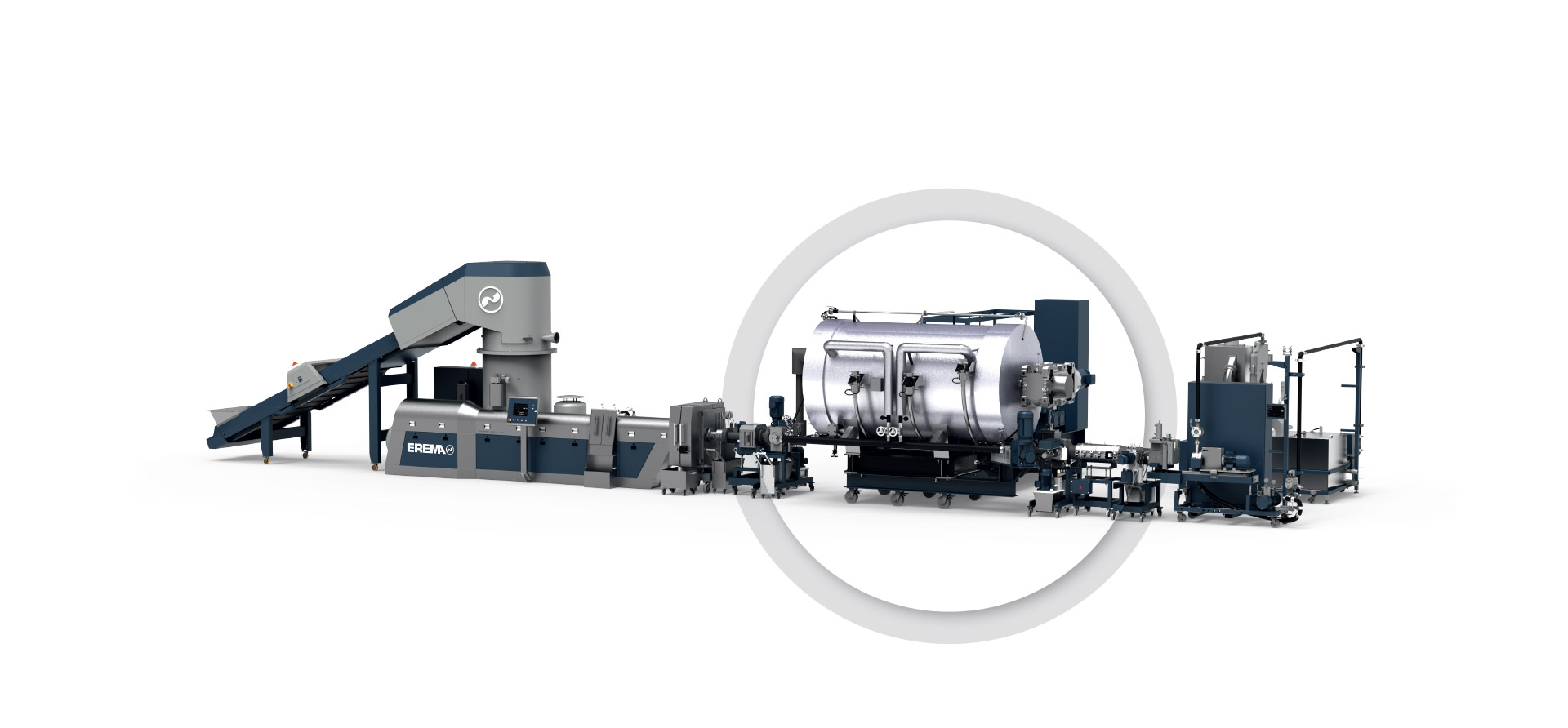 This is made possible by combining the INTAREMA® machine, which has proven itself thousands of times over, with innovative IV Uptimiser technology. While the INTAREMA® prepares the material for extrusion using its Preconditioning Unit and Counter Current technology to ensure perfect homogenisation, pre-drying, removal of volatile components, and subsequent gentle PET melting, the new IV Uptimiser ensures repolymerisation, IV lift and efficiently cleans the fibres of finishing additives.