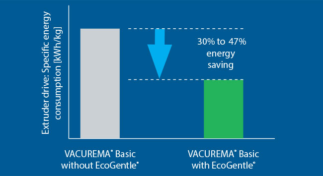 Compared to a VACUREMA® Basic with conventional plasticising unit (without EcoGentle®), which previously already achieved the best energy efficiency values, a VACUREMA® Basic with the new EcoGentle® plasticising unit consumes between 30% and 47% less energy for the extruder drive* - depending on the material properties (specific energy consumption kWh/kg).
